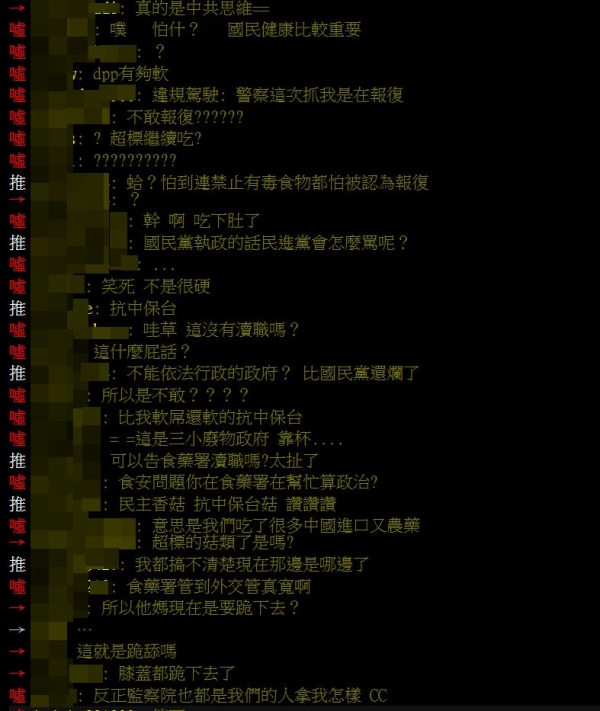 該說法隨即也在PTT掀起熱烈討論,不少鄉民紛紛痛批,「超標還放行是讓國民以身試毒嗎?」、「就報復呀,有什麼好客氣的」、「全部給食要署吃啦,吃好吃滿」、「公信力不值錢的概念」、「人民是不是覺得遇到詐騙集團了呢」、「自己的毒農漁別人不要,還要幫別人吃」、「不用打仗就先被毒死了」、「食藥署的工作是管外交嗎」、「違規駕駛:警察這次抓我是在報復」。