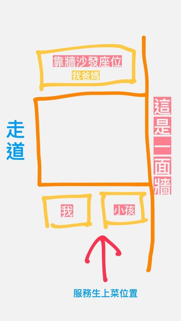 1歲小孩需要坐餐椅,所以無法坐內側沙發,只能在外側走道區,點完餐後上餐具時,第一位服務生直接從我跟孩子的上方送餐具,當時我在準備小孩餐具,有跟他說不好意思,可以從我左手邊上嗎,服務生說好的。