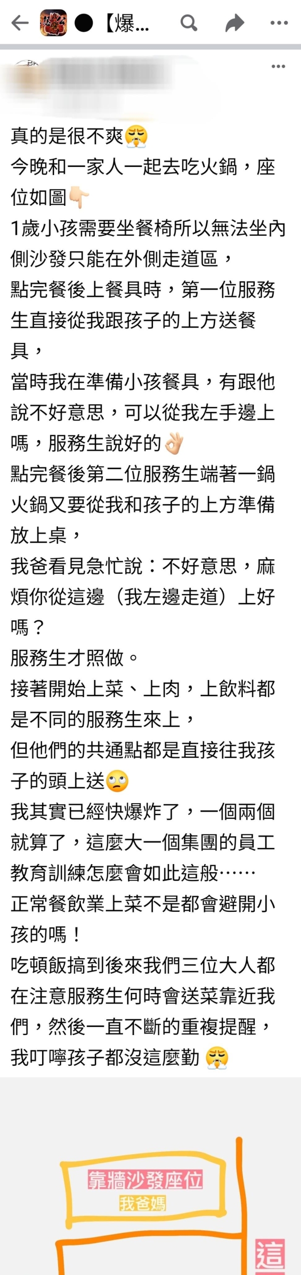 點完餐後第二位服務生端著一鍋火鍋又要從我和孩子的上方準備放上桌,我爸看見急忙說: