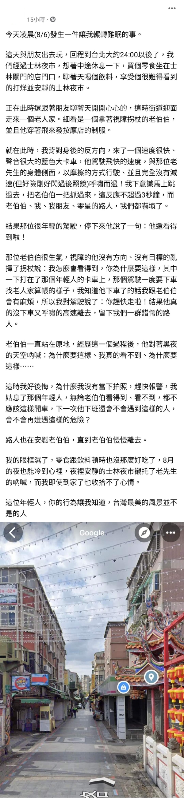 我的眼框濕了,零食跟飲料頓時也沒那麼好吃了,8月的夜也能冷到心裡,夜裡安靜的士林夜市襯托了老先生的吶喊,而我即使到家了也收拾不了心情。
