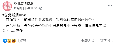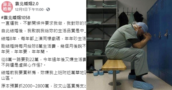 近日在臉書「靠北婚姻2.0」上有男醫師無奈表示,他每天看診超過12小時一年只休7天,為的就是滿足老婆日漸壯大的虛榮心,生活費從一開始的8萬要到22萬,還要求他要買豪宅背房貸月繳11萬,完全不顧該名醫生的身體健康和心理狀態,其中有網友看了在底下留言:其實你的問題最大!