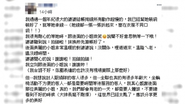當時一名年紀很大的老婆婆身體不方便、掏錢動作很慢,於是女員工向後面排隊的小姐微笑說「不好意思,稍等一下哦!」老婆婆感到相當不好意思,也轉頭過去對小姐道歉,更願意先讓她先結帳,沒想到後方小姐只是用台語溫暖地說「沒關係,哩道道來,溫隆ㄟ老,溫沒趕時間(沒關係,妳慢慢來,我們都會老,我們沒有趕時間)」。