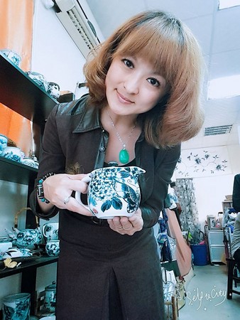只見照片中,她留著金色短捲髮,眼妝艷麗,大方和店員合照,
