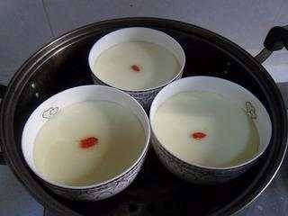 6、等雞蛋液半凝固,去掉保鮮膜,放入枸杞,再蒸2分鐘