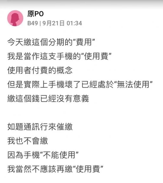 此外,原PO認為,她繳得分期費用是該手機的「使用費」,是一種使用者付費的概念,但實際上手機已壞,已處於「無法使用」,因此「繳這個錢已經沒有意義」。