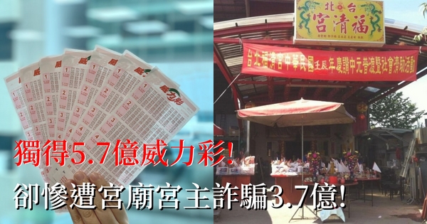 一名獨得5.7億元的威力彩得主捐錢蓋廟做公益,卻遭到宮廟宮主詐騙高達3.7億元