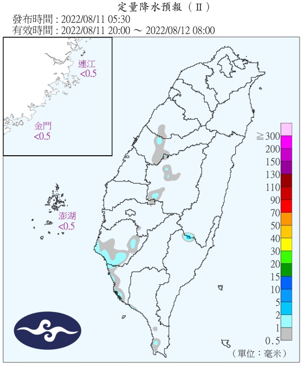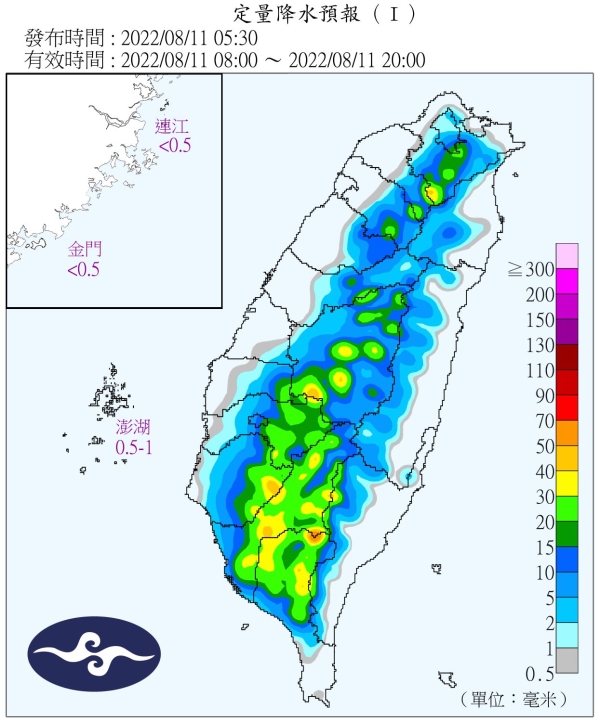 午後西半部和各地山區有局部短暫雷陣雨,西半部有局部較大雨勢;