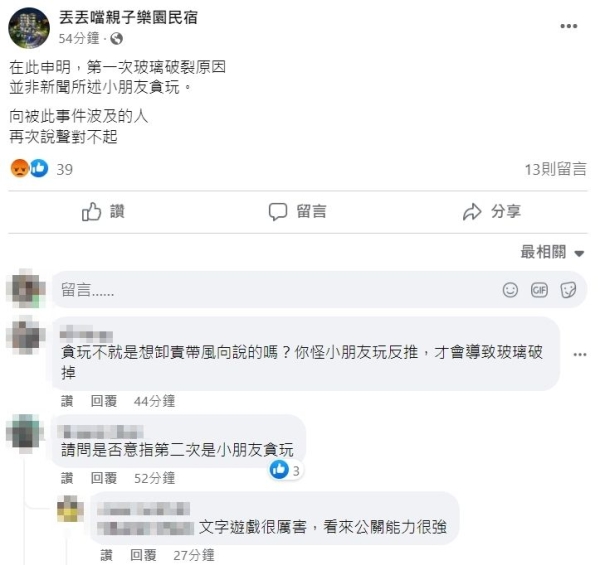 ▲業者二度道歉,但是針對第一次玻璃爆破而作解釋。(圖/翻攝丟丟噹親子樂園民宿)