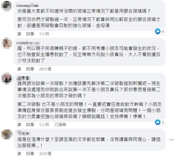 「你是當大家都不知道淋浴間的玻璃正常情況下都是用膠合玻璃嗎?更何況你們才破裂過一次,正常情況下都會採用比較安全的膠合玻璃才對,卻還是用破裂會四射的強化玻璃,金母湯」、