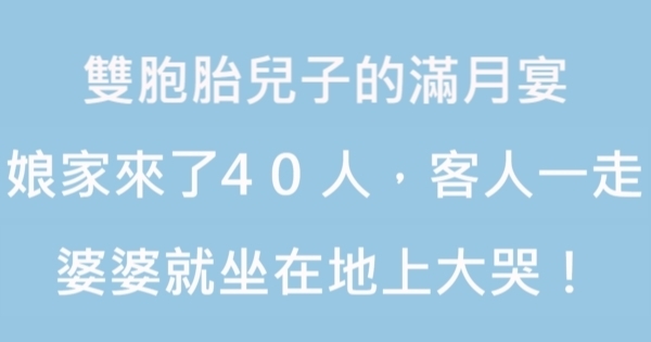 娘家人都恭喜我婆婆,我看她有點不太高興,下午娘家人回去了之後,屋裡一些人幫她收拾,等人走了,她一下子坐在我房間裡大哭起來,「當初你要是早一點去做了超音波,現在就不是這樣了,以後這兩個男孩怎麼養得起」。