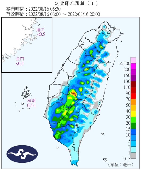 午後中南部、大台北和各地山區有局部短暫雷陣雨,中南部有局部大雨機率