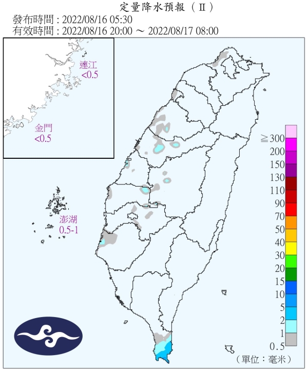 而東南部和恆春半島整天有局部短暫陣雨,清晨西半部也有局部短暫陣雨。