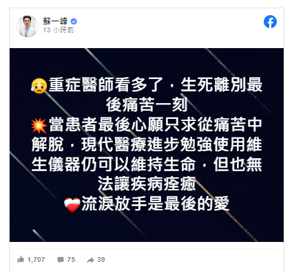 蘇一峰在臉書上發文表示,重症醫師看過很多案例,知道生離死別是最後痛苦的一刻,雖然現代醫療進步,勉強使用維生儀器可以維持生命,然而卻無法讓疾病痊癒,當患者最後的心願「只求從痛苦解脫」,家屬雖然不捨,但「流淚放手是最後的愛」。