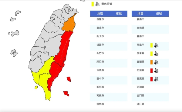 宜蘭縣地區為橙色燈號,有連續出現36度高溫的機率;高雄市、屏東縣地區為黃色燈號,請注意。