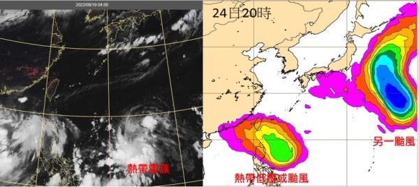 ▲左圖:今(19日)晨4時真實色雲圖料顯示,菲律賓東方熱帶雲簇醞釀發展中。