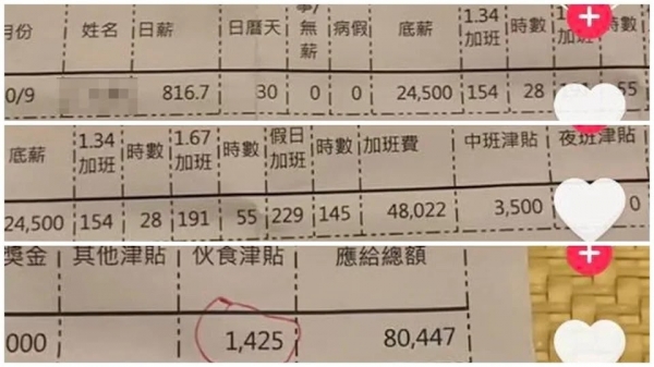 該名網友在PTT上轉PO一名越南移工薪資條,實際找到當事人的抖音影片,拍下9月的薪資條,上面記載著該名移工底薪24500元,共加班228小時,加班費為48022元,中班津貼3500元,伙食津貼1425元,總薪資為80447元。這讓原PO驚嘆,勝過一大堆台勞餐飲服務業。