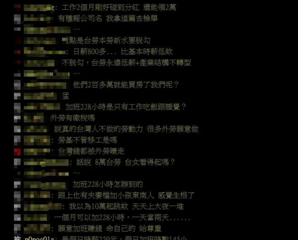 移工願意吃苦猛加班的經歷曝光後,網友紛紛驚呼,「這根本沒在睡了」、「人家肯做我沒啥意見」、「Respect!真的能吃苦」、「敢拚的人真的就是這麼狂」、「台灣四、五年級生也是這樣拚過來的,現在年輕人不肯吃苦,外籍移工搶著做」、「都不用睡覺太神了」、「辛苦錢」、「這加班時數....真的猛」、「來台灣瘋狂加班幾年後就能買房買車了,台灣人還是躺平吧」、「願意加班賺錢,命自己的,給尊重」。