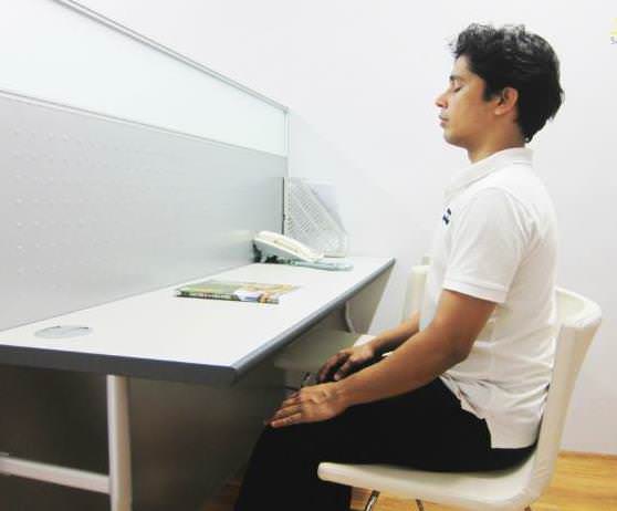 1. 坐在椅子上將背部靠在椅背上,頭部有所支撐,雙腳有力而堅定踩在地板上,眼睛閉上。