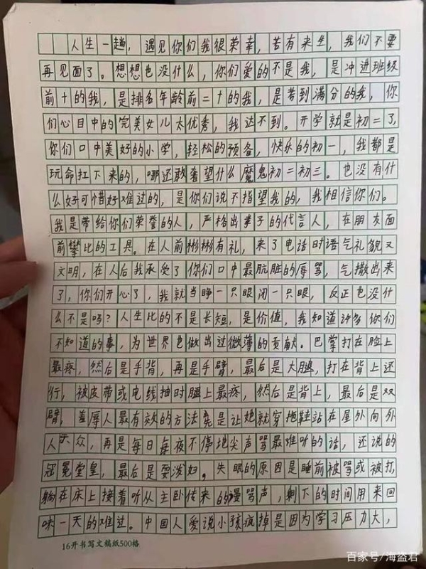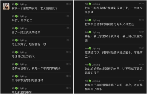 女孩在遺書中表示,父母要求她保持好成績,如果達不到目標,就會言語或肢體攻擊她。她曾經被搧過掌、手指、手臂、大腿和背部。女孩絕望說:「你們愛的不是我,是衝進班級前10,年級排名前20的我,是考到滿分的我,你們心目中的完美女兒太優秀,我達不到」,「我只是一個給你們帶來榮耀,在你們在朋友面前攀比的工具」。