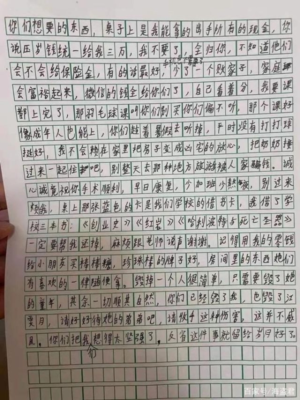▼輕生之前,女孩將3萬元人民幣的壓歲錢放在桌上,還給父母。她請父母幫忙還3本書給學校,並跟老師說聲謝謝,再買棒棒糖給其他的同學。她說:「毀掉一個人很簡單,只需要毀掉她的童年,一切都順其自然」,「你們已經毀了我,請好好看待弟弟吧,請收手這種傷害」。