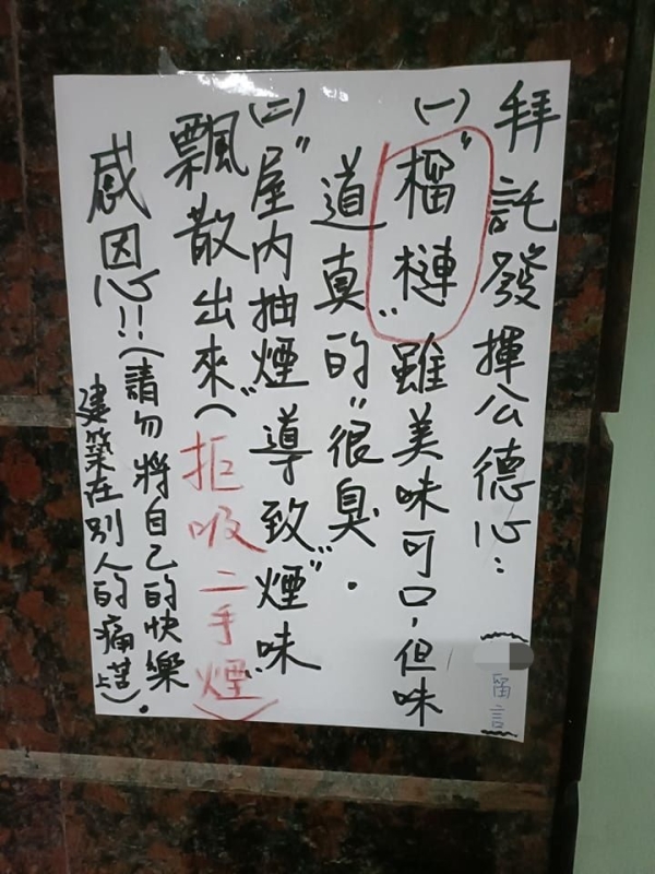 一名女網友29日在臉書PO文抱怨,因為在家裡吃榴槤和抽菸,被鄰居貼公告嫌臭