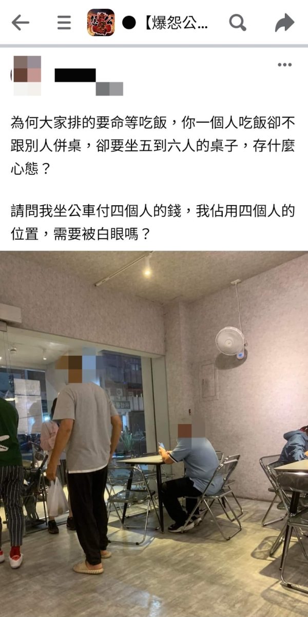 「先來後到是禮貌吧,店家也沒規定非得併桌吧,再者,疫情如此嚴重的情況之下,你敢跟陌生人隨便併桌嗎?」