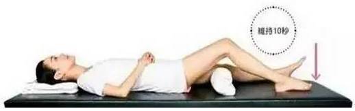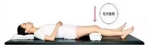 平躺於床上,在右腿膝下放一個卷緊的毛巾。