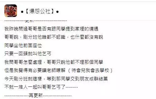 這名單親媽媽在臉書社團「爆怨公社」發文說,雖然單親,但她也努力地讓孩子過最好的生活,誰知大兒子開學不到一星期,已經被前座同學說是「乞丐」,但該名媽媽指每位同學也只是短短認識數天,不可能與新同學談起家庭狀況,而兒子被連續說了「乞丐」後,也沒有告知老師,只是默默的寫下 :「因為家裡窮,所以在學校有人說我是乞丐!」這讓她相當難受,也順勢開導了孩子。於是她便決定到學校向老師了解狀況,以防日後兒子再被說是「乞丐」。