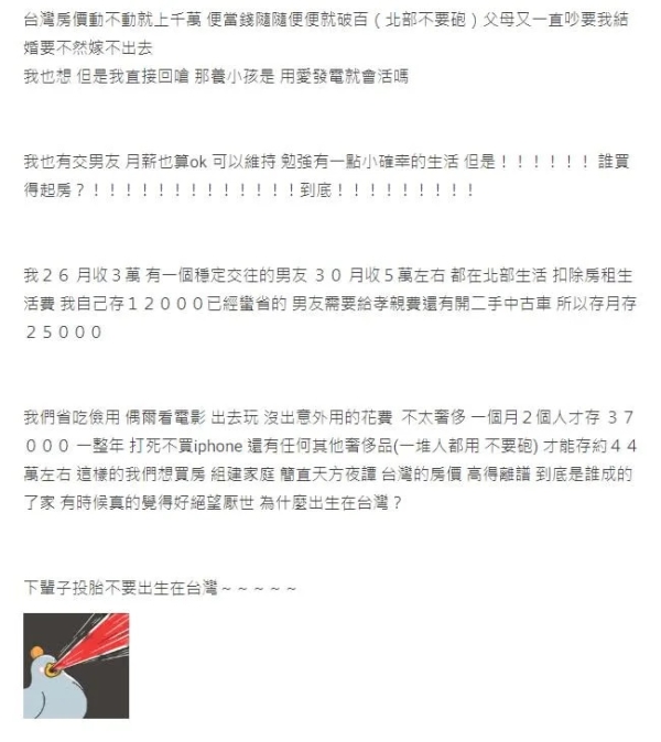 房價連年漲,很多年輕人大呼吃不消。日前一名26歲的女網友在Dcard心情板以「好想死,在台灣根本沒有未來」為題發文,表示台灣房價動不動就上千萬,北部便當錢隨便就破百,她和男友的月薪勉強能有些小確幸生活,但根本買不起房,父母又一直催她趕快結婚,她也很想結婚,但根本沒多的錢可以養。