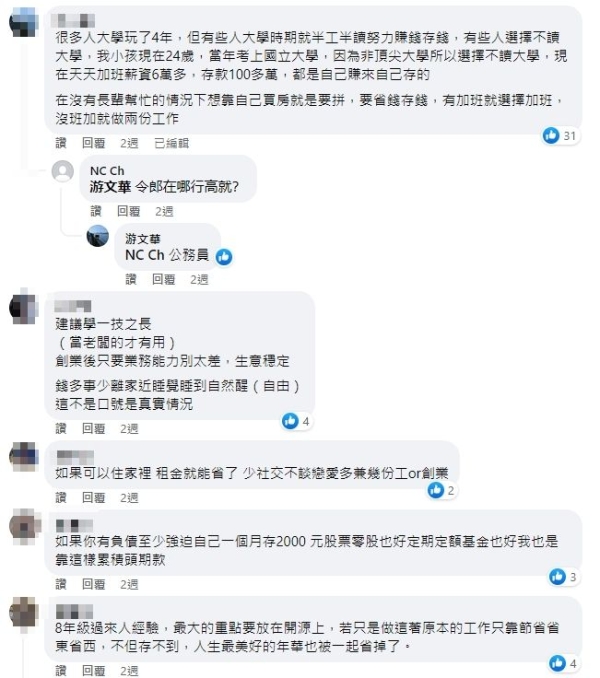 留言串中,一票8年級生則勵志分享,就是靠多賺、強迫儲蓄存來的,「8年級生有頭期款,吃住家裡,選薪水較高的工作,每個月強迫儲蓄薪水的7至8成學習投資理財,早點結婚,兩個人一起存會快很多」、「認識一些8年級生,一天做好幾份餐飲工作,不是正職的時薪比較高,還斜槓跑熊貓,一天工作超過十小時,沒空花錢也就存得快」、「8年級過來人經驗,最大的重點要放在開源上,若只是做這著原本的工作只靠節省省東省西,不但存不到,人生最美好的年華也被一起省掉了」