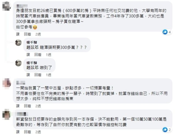 「我80年尾,自己賺的,沒有家人贊助。朋友90的也是自己工作後賺的,穩定有發展的主業加副業,開源節流,頭期款後,原本的房租也就是房貸」、「多賺少花,現金流的管控!還有別亂花錢,要學會如何開源也要會節流,我跟男友買房中古屋沒有靠家長,裝潢也是一筆錢,我8年級、男友7年級尾」。