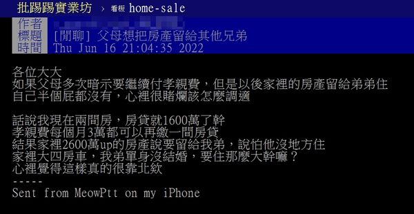 原PO在PTT發文表示,他本身背了兩間房子的貸款,共1600萬元,父母多次暗示要繼續給每個月3萬元的孝親費,又說以後家裡的房產要留給弟弟住,自己則什麼都沒有。