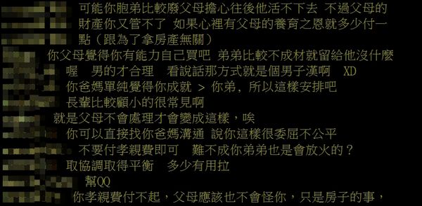 文章曝光後引起熱議,不少網友認為,這種家務事很難有正解,紛紛留言表示,「房子是你父母的你有什麼資格管」、「大概是弟弟較不成器父母補償心理吧」、「這種家務事沒啥正確答案」、「長輩比較顧小的很常見」、「父母覺得你有能力自己買吧」、「長輩都會有一種強者應該要照顧弱者的心態」。