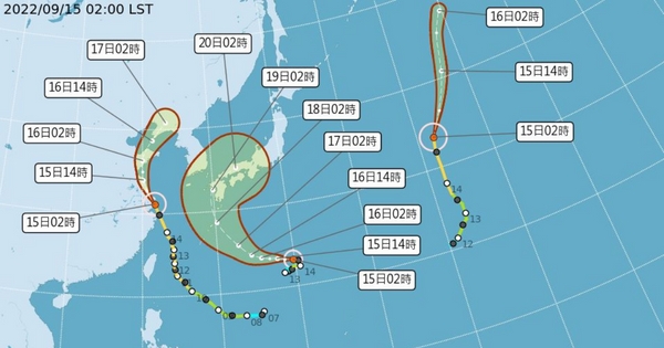 至於民眾關心的「三颱共舞」情況,梅花颱風在14日晚間已經在浙江登陸;