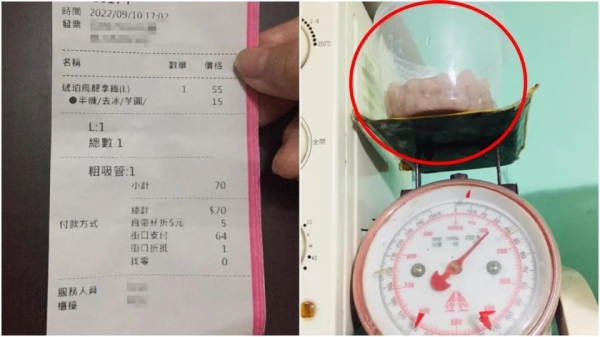透露日前去某連鎖手搖店購買大杯烏龍拿鐵加芋圓,