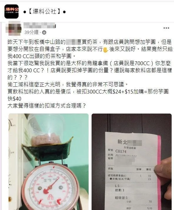 痛批「偷工減料這麼正大光明,我覺得真的非常不可思議,這樣買飲料加料的人真的是傻瓜,被扣300 C.C大概$24+$15加購=那份芋圓快$40,大家覺得這樣的扣減方式合理嗎?」