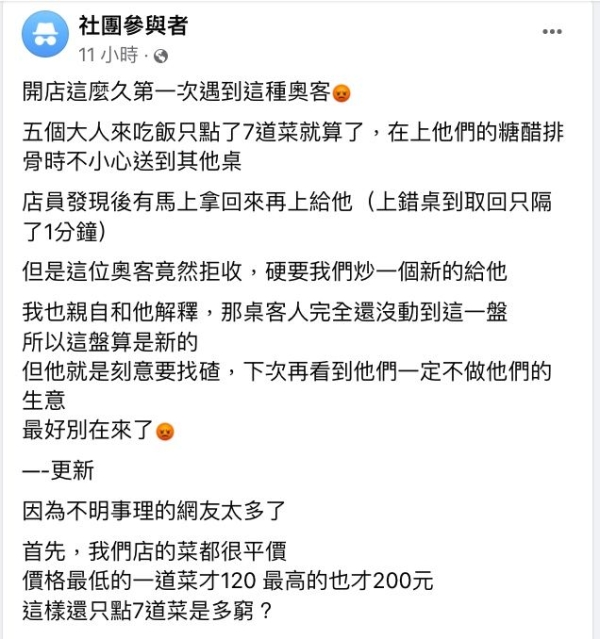 忍不住抱怨「開店這麼久第一次遇到這種奧客」。