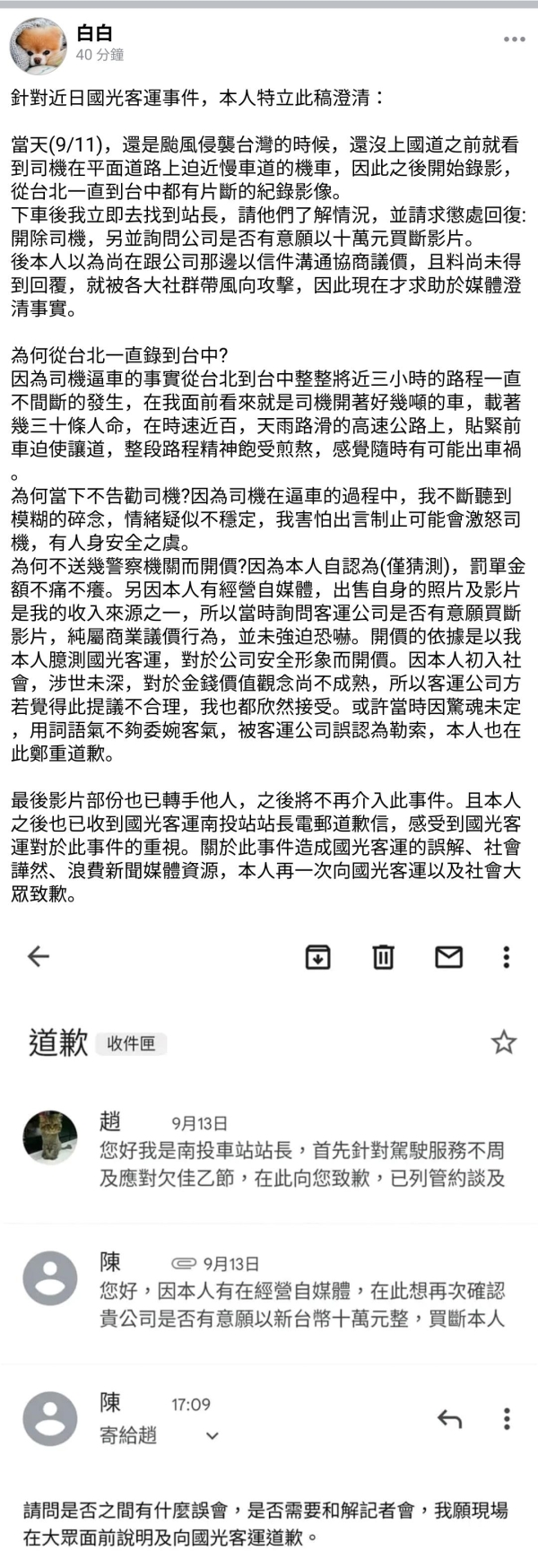 投訴司機危險駕駛要10萬封口費 國光:不合理要求