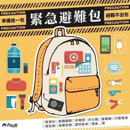 「養成平時把避難包放在房間或是客廳可得地方,以備不時之需,保護自身也保護家人!」
