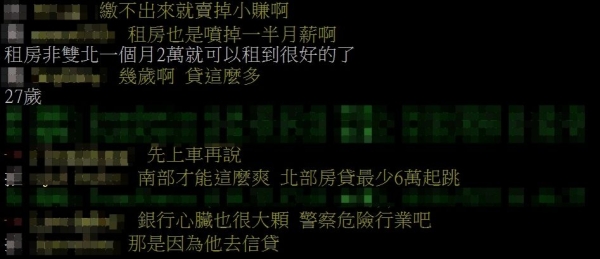 文章引發網友討論,「繳不出來就賣掉小賺啊」、「租房也是噴掉一半月薪啊」、「先上車再說」、「南部才能這麼爽,北部房貸最少6萬起跳」、「那是因為他去信貸」。