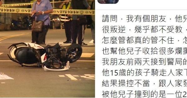 而前兩天,朋友接到來自警局的電話,對方表示他兒子騎走路人下車買飲料、沒熄火的摩托車,無駕照操作不當之下不小心發生了車禍。