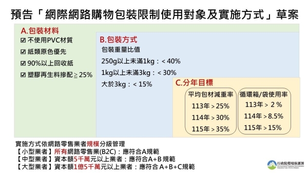此外,環保署指出,資本額5千萬元以上業者,商品之包裝材用量須符合分級包裝重量比值規定;