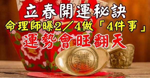 不少民眾認為農曆春節大年初一是一年的開始,在傳統命理學之中則是以二十四節氣之中的「立春」作為分界點,李沄潔命理師指出,在西漢時代的古書籍中有記載「立春日,四時之始也」,意指立春為四季的開端,也是萬物復甦生氣勃發之際,非常適合幫自己轉運造運,李沄潔命理師就要和大家分享4個在立春當天進行的開運秘訣,想告別霉運或增強運勢的民眾不妨好好把握。