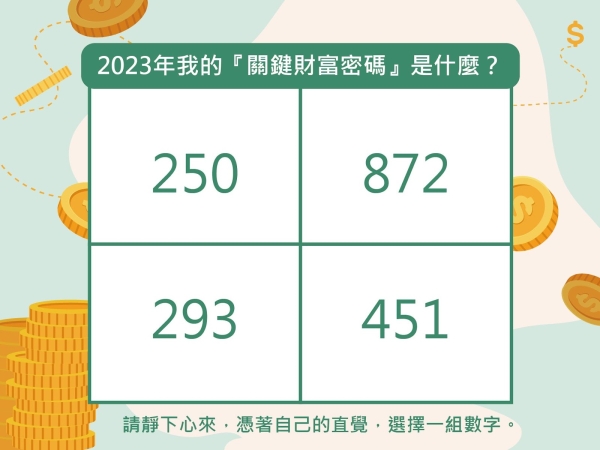 面對「萬物皆漲薪水不漲」的大通膨時代,除了守住錢財外,更要懂得如何聰明聚財,以下帶來宮小立老師的數字易經占卜,趕緊選擇一組2023年你的「財富關鍵密碼」!