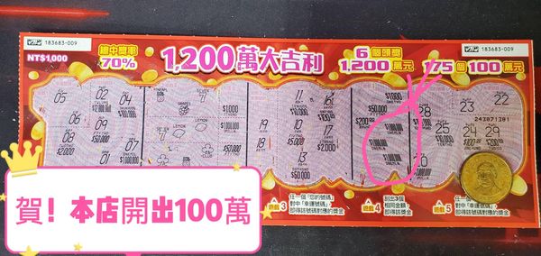 「吉立加彩券行」業者表示,大年初一(1月22日)有一名年輕媽媽推著嬰兒車來買彩券,當下刮1000元的「大吉利1200萬刮刮樂」,就刮中2獎100萬元,笑著帶孩子離開。