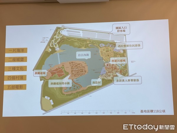 園區會依照電影《台灣三部曲》來做規劃,將會打造1片海洋、2座城堡、3種文化、4個主題村、5部影片,也會重建台江內海、熱蘭遮城、普羅民遮城、大灣市鎮、赤崁漢人聚落、海盜村以及西拉雅部落,從大門一開始就會有17世紀的鐘響特色,每天早上都會有開門儀式,要前往「熱蘭遮海陸市鎮」會有3種方式,分別為海水之中開一條道路「涉水而過」、第二為搭船過海,最後為沿著旁邊「歷史人文步道」走路,沿路可欣賞不同時間台灣的景色。