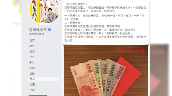 粉專「湯鎮瑋老師」稍早貼文,分享「五色錢鈔生財法」,準備物品只需兩種,「鈔票」、「全新紅包袋」。