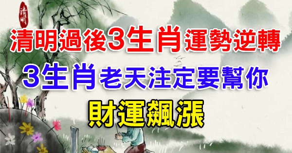 《搜狐網》命理專欄整理出清明過後,運勢開始逆轉的3大生肖,桃花飛漲、事業扶搖直上;專門分享運勢的「生肖星座運勢命理玄學」也報導,以下有3生肖,開工日將會五福臨門、財運飆漲。
