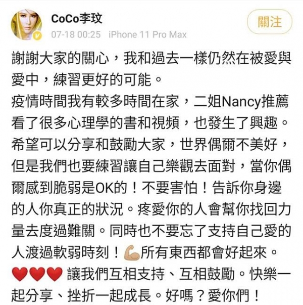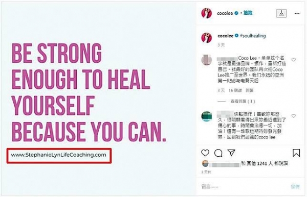 李玟在微博中表示要醫治破碎心靈,IG則期許自立自強,卻貼出為情傷或失婚人士提供心靈輔導的網站連結(紅框處)。