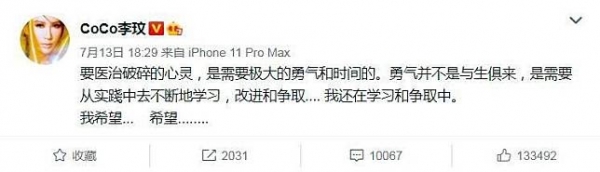 她在微博寫下「要醫治破碎的心靈,是需要極大的勇氣和時間的。」
